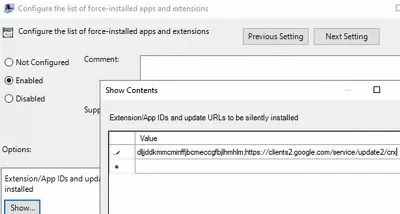 Now, in the GPO editor console, go to Computer Configuration -> Policies -> Administrative Templates -> Google -> Google Chrome -> Extensions. Enable the policy Configure the list of force-installed extensions.