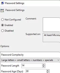 - Then enable the Password Settings option. Here you must specify the password complexity, length, and change frequency parameters;The following LAPS password settings are enabled by default: password complexity, 14-character password length, and password change every 30 days.
