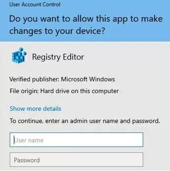 When you run regedit.exe, you will see a User Account Control prompt asking for the administrator credentials (Do you want to allow this app to make changes to your device?). If you do not provide a password and do not confirm elevation, the app won’t start.