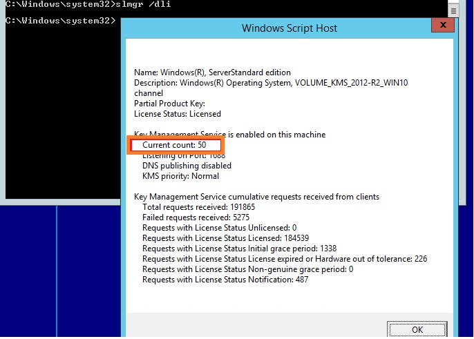 The matter is that the KMS server has a so-called activation count (kms counter) which value is incremented after each activation request is received from a network client. When accessed, the KMS server assigns a unique identifier CMID (client machine identification) to each client and puts it into local database (cache). In this case, the OS of the computer from which the request was received is not activated immediately. These activation requests are accumulated in the internal KMS cache on the server. This occurs until a certain minimum threshold of activation requests received within the last 30 days has been overcome in the KMS database. This threshold is 5 activation requests from the server OSs and 25 activation requests from the desktop Windows OSs (the activation thresholds for desktop/server OSs are independent, i. e. if the value of the KMS count has exceeded 25 activation requests from client OSs, this server will not activate server OSs until the number of activation requests from these platform reaches 5). If the client does not contact the KMS activation server during 30 days, it is automatically removed from the KMS database, and the KMS activation counter is reduced by one.
