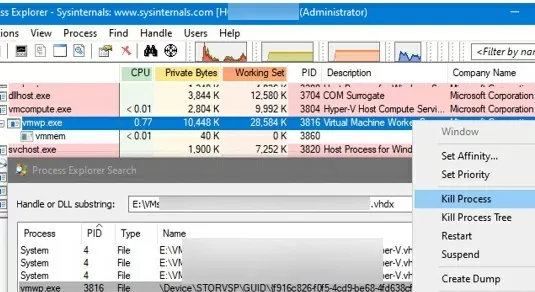 Similarly, you can find and stop a hung virtual machine process on a Hyper-V host using the Process Explorer tool.