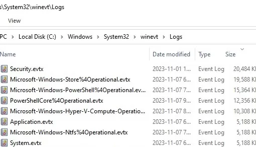 By default, Windows stores log files with an EVTX extension in the %SystemRoot%\System32\Winevt\Logs\ directory.