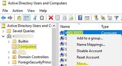 By default, when you join new computers to a domain, they are placed in the built-in Computers container in the domain root. To manually move a computer account to a different OU (Organizational Unit), you can either drag and drop it or use the Move menu item.