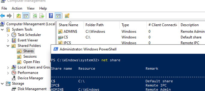 Administrative Shares are used in Windows to remotely access and manage a computer. If you open the computer management console (compmgmt.msc), expand the System Tools -> Shared Folders -> Share section, or run the net share command, you will see a list of admin shared folders (these folders are hidden in the network neighborhood and access to them is restricted).
