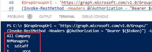 $Groups=(Invoke-RestMethod -Headers @{Authorization = "Bearer $($token)"} -Uri $GrapGroupUrl -Method Get).value