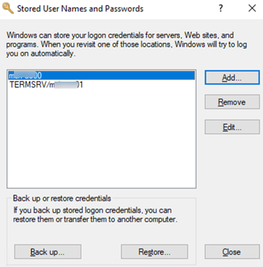 TERMSRV\hostname format.Here you can add a saved credential, edit it (you cannot view a saved password in the graphic interface), or delete any of the entries.
